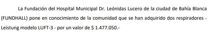 Desde el Municipal señalaron que cada respirador tiene un valor cercano a los $ 750.000, por lo que la inversión fue de $ 1,5 millones aproximadamente.